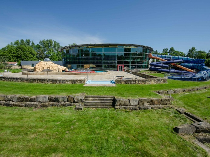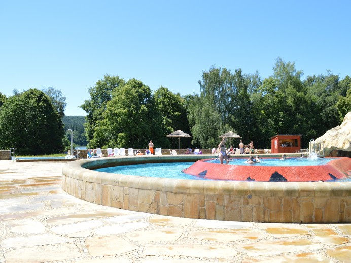 Im Außenbereich steht Ihnen ein Strömungskanal mit Wasserfällen und Jetstreams zur Verfügung. Bei schönem Wetter können sich Sonnenanbeter auf den wunderschön angelegten, terrassenförmigen Liegewiesen räkeln oder auf einer der Liegen auf der Sonnenterrasse Platz nehmen und den Blick auf den Stausee Hohenfelden genießen.