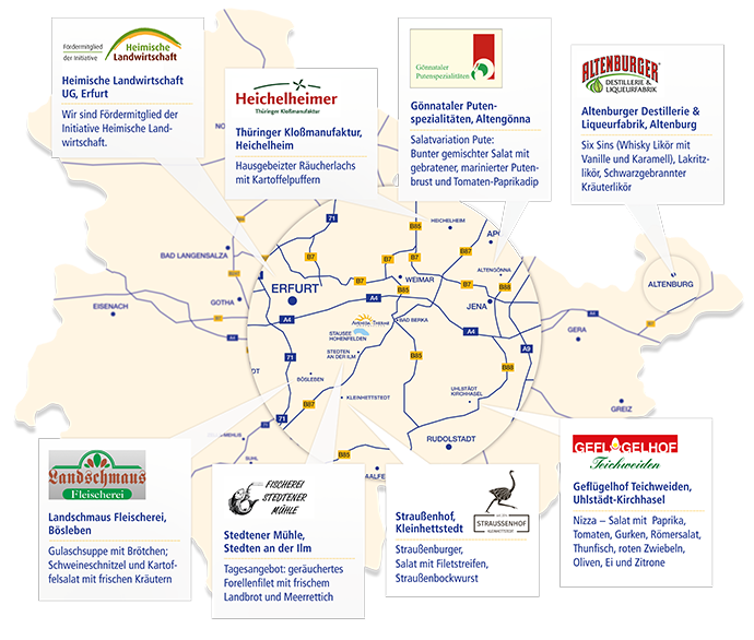 Im Einklang mit der Natur haben wir unser Speisenangebot an Fleisch, Fisch und Geflügel nahezu vollständig auf Produkte aus der Region umgestellt. Genießen Sie abwechlungsreiche kulinarische Angebote mit den Produkten der heimischen Landwirtschaft und aus artgerechter Tierhaltung. Im Saunarestaurant werden die Produkte der regionalen Erzeuger zu schmackhaften Gerichten wie dem Schweineschnitzel und die deftige Gulaschsuppe aus der Landschmaus-Fleischerei Bösleben, der Salatvariation "Pute" von den Gönnataler Putenspezialitäten oder die Kartoffel aus Heichelheim weiterverarbeitet. Auch im Thermenrestaurant werden die Zutaten für die beliebte Bockwurst, das Wiener Würstchen, die Bolognese und die Kartoffelpuffer von den regionalen Partnern bezogen und weiter verarbeitet.