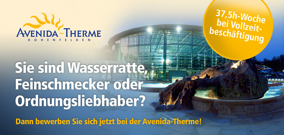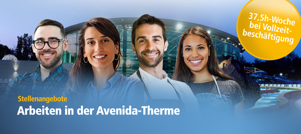 Die Vielzahl der Tätigkeitsfelder in der Avenida-Therme reicht von einem Minijob bis hin zu einer Festanstellung in Vollzeit. Auf den folgenden Seiten finden Sie alle aktuellen Stellenangebote mit allen wichtigen Informationen, um Teil unseres Teams zu werden. Gern können Sie sich auch mit einer Initiativbewerbung bei uns vorstellen.